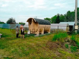 Эту баню-бочку купили спонтанно, искали с мужем варианты, наткнулись совершенно случайно на вашу фирму. Приехали на производство, все посмотрели. Нам понравился выставочный образец, заказали такую же. Нам изготовили ее в течение двух недель. Доставили в собранном виде! Вечером уже парились! Баня пахнет кедром изумительно! Поэтому рекомендую.