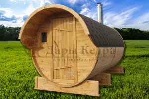Это изделие круглой вытянутой формы. Козырек не только украшает баню, но и защищает оставленную обувь от дождя. Лавочки из кедра находятся по всей длине бани-бочки с обеих сторон. Печь расположена в парилке около дальней стены. Время растопки такой печи не превышает 30 минут. В зависимости от выбранного размера круглая баня-бочка с козырьком имеет следующую комплектацию: