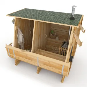 Это квадратное изделие с закругленными углами. За счет такой конструкции во время топки воздух циркулирует по кругу, поэтому баня-бочка нагревается не более 30 минут. Баня включает в себя раздевалку и парилку. Лавочки из кедра установлены по всей длине бани-бочки с обеих сторон. Печь расположена в парилке около дальней стены. Для удобства пользования в раздевалке находится вешалка и полочка из кедра. По вашему желанию баню-бочку квадро можно укомплектовать козырьком, верандой и печью с внешней загрузкой, благодаря которой весь мусор после топки остается на улице. Баня-бочка квадро не требует полноценный фундамент, поэтому при необходимости ее можно перенести в другое место.