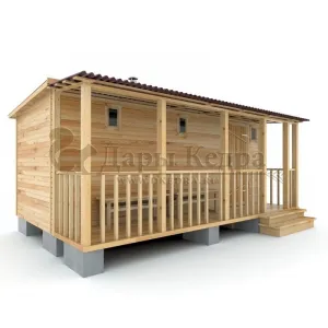 Это классическая прямоугольная модель бани с тремя отделениями: предбанником, моечной и парилкой. Для удобства пользования предбанник оснащен лавочкой и вешалкой. В моечной находится лавка и полочка из кедра. Парилка оборудована двухуровневым открытым полком и печью. Время растопки такой бани не превышает 30 минут. На просторной веранде можно оставить вещи или отдохнуть после парения. Каркасно-щитовую баню можно заказать как в готовом, так и в разборном варианте. В разборной модели готовые щиты из кедра быстро собираются в полноценное строение, что также позволяет исключить лишний строительный мусор. Такая баня не требует полноценный фундамент, поэтому при необходимости ее можно перенести в другое место.