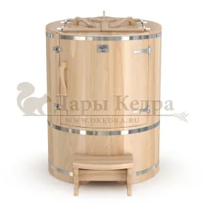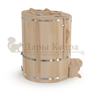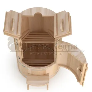 Это круглая фитобочка из кедра увеличенных размеров с толщиной стенок 45 мм. Подходит для людей высокого роста и крупной комплекции. Фитобочка оборудована откидными створками, дверцей и отверстием для головы. Верхний скос изделия делает положение головы более комфортным и улучшает обзор. Во время парения человек сидит внутри кедровой бочки, а голова находится снаружи. Благодаря этому исключается возможность перегрева. Подлокотники из кедра, встроенные ручки на створках и двери делают эксплуатацию более удобной.