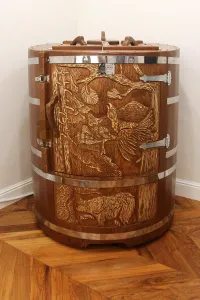 Резьба на дверце кедровой бочки (габаритные фитобочки)