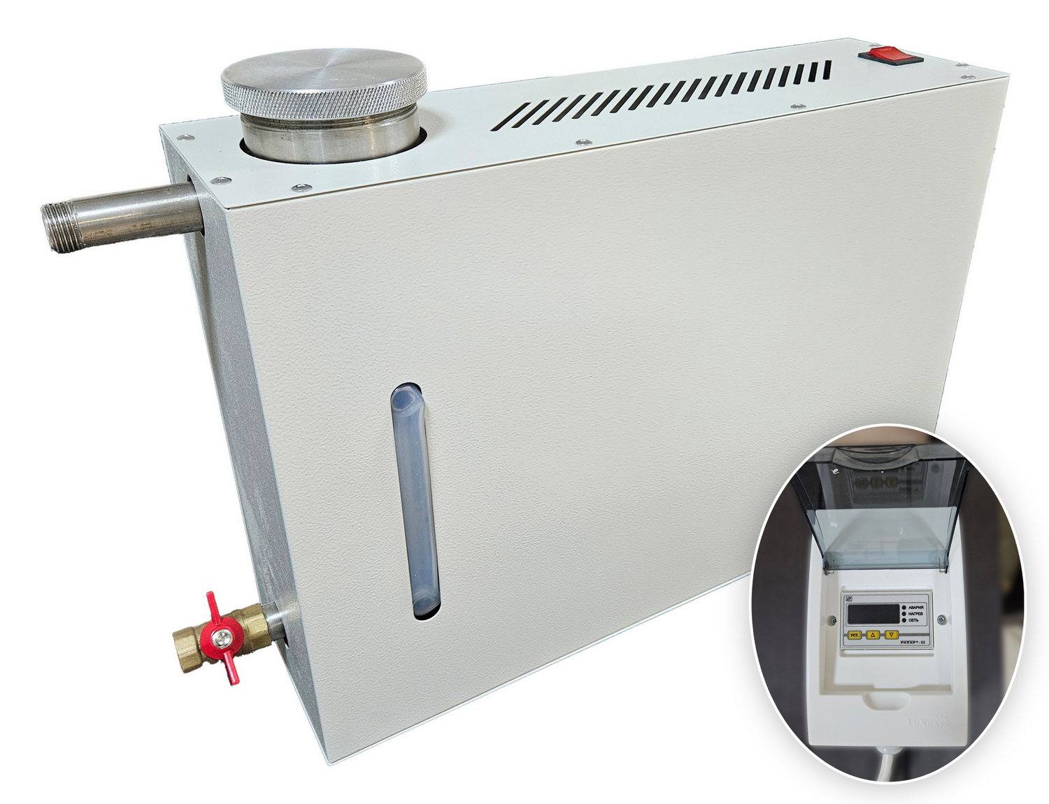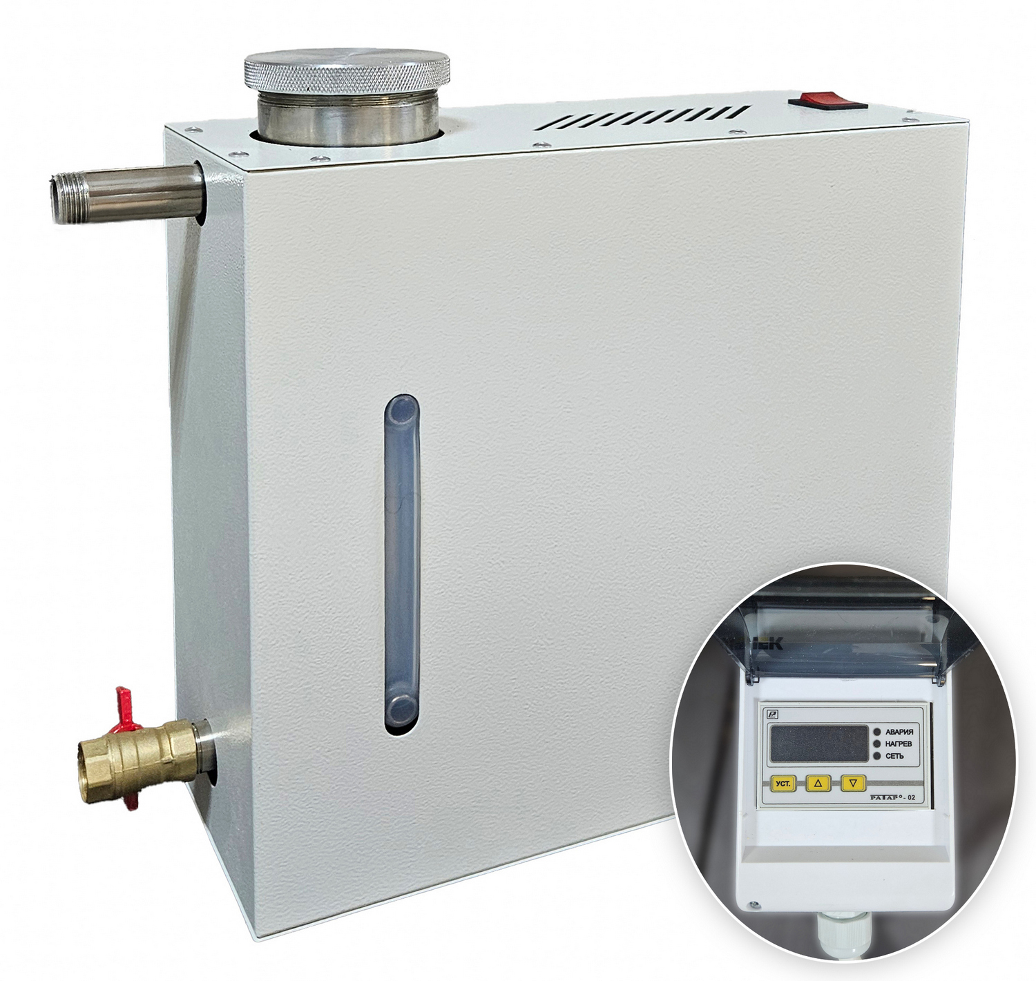 • Парогенератор накопительный с цифровым блоком управления и таймером, 2,5 кВт Прибор служит для создания пара путем закипания воды. В металлическом корпусе парогенератора находится бак для воды со съемной аромаемкостью в виде сеточки. Рядом располагается индикатор в виде трубки, благодаря которому осуществляется визуальный контроль за уровнем воды. Парогенератор накопительного типа работает от электричества и не требует подключения к водопроводу. Вода в него добавляется самостоятельно. Для удобства пользования парогенератор имеет выносной пульт управления, который позволяет установить температуру, мощность и время процедур парения. При превышении заданной температуры и низком уровне воды устройство отключается автоматически. Звуковой сигнал таймера дополнительно сообщает об этом. Целебный пар поступает в фитобочку по паропроводу и насыщает организм человека полезными веществами.