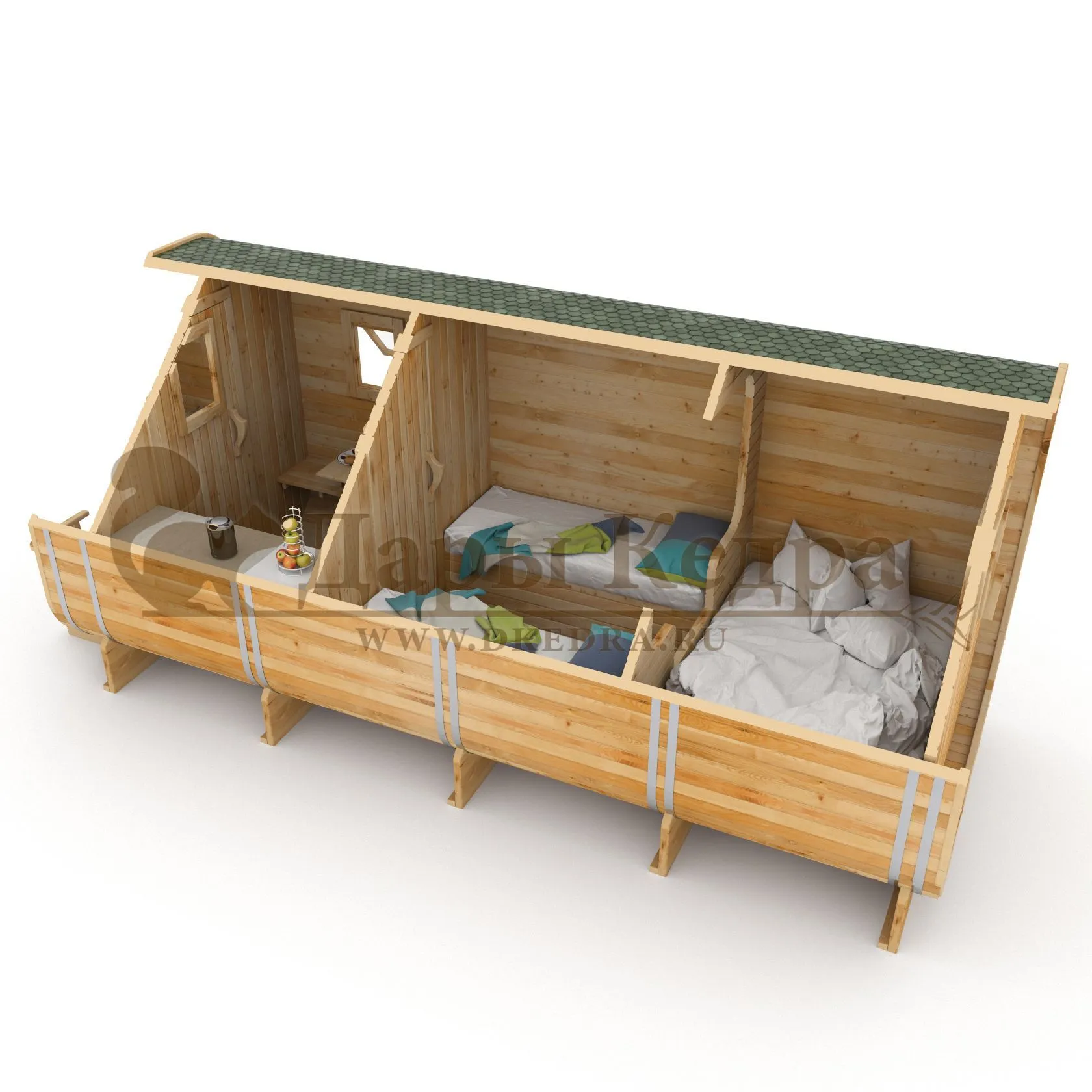 Кемпинг дом «Квадро» с боковым входом Такой кемпинг дом удобное и практичное решение для дачного использования или обустройства загородных баз отдыха. Увеличенные размеры и боковой вход со стеклянной дверью позволяют зонировать внутреннее пространство помещения. Домик включает в себя: Прихожую, совмещенную с кухней. Здесь находится стол, полочки и вешалка для одежды. Спальная комната с двумя односпальными кроватями. Спальная комната с одной полутора спальной кроватью. По вашему желанию любую из комнат можно укомплектовать душевой зоной с санузлом. Кемпинг дом изготовлен из хвойных пород древесины. Кровля из мягкой черепицы обеспечивают защиту от осадков.