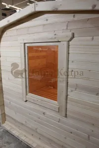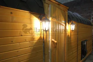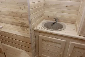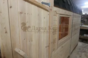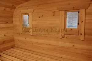 Домик с тремя помещениями подходит для дачного использования в теплое время года или обустройства загородных баз отдыха. Прихожая и кухня занимают одну комнату, в которой стоит стол из кедра. Две другие оборудованы четырьмя деревянными лежаками, по желанию их можно заменить на двуспальные кровати. Либо обустроить санузлом и душевой зоной. Для удобства пользования кемпинг дом можно укомплектовать верандой с лавочками или козырьком.