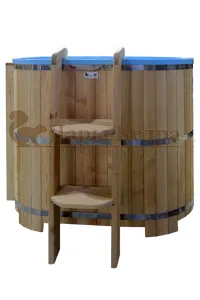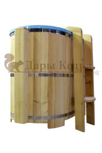 Особенность этой модели заключается в сборке купели по технологии лунный-паз. Паз (углубление) одной доски прочно соединяется с выемкой следующей. Такая сборка осуществляется без клея и гвоздей. Готовая конструкция прочно фиксируется нержавеющими обручами. Пластиковая вставка придает изделию красивый внешний вид, увеличивает срок службы и облегчает уход за купелью. Для удобства пользования купель оснащена лавочками, приставной и внутренней лестницей из кедра. Подходит для комнатного и уличного использования.