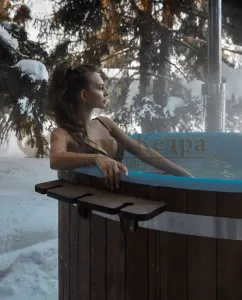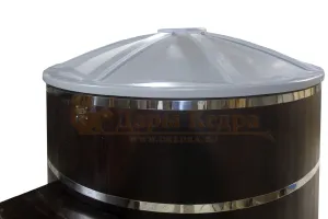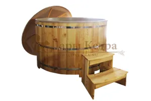 Это уличная подогреваемая купель с круглой внутренней чашей из термопластика, которая имеет цельную форму вместе с сиденьями и дном. Для удобства пользования купель фурако оборудована приставной лестницей. Подогрев воды осуществляется за счет внешней печи с дымоходом. Термопластик устойчив к воздействию температур, облегчает уход за фурако и увеличивает срок ее службы.