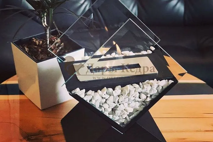 Камин квадратной формы Almaz. Когда ремонт уже закончен, и вдруг появилась внезапная идея установить биокамин, напольная модель - идеальное решение для спонтанных перестановок. Камин «Алмаз» украсит любое помещение: будь то квартира, коттедж, офис, апартаменты в гостинице или санатории. В стандартной комплектации так же, как и в предыдущем варианте, имеется защитное стекло. Линия огня - 15 см. Характеристики изделия: длина - 300 мм, высота - 435 мм, глубина - 215 мм.